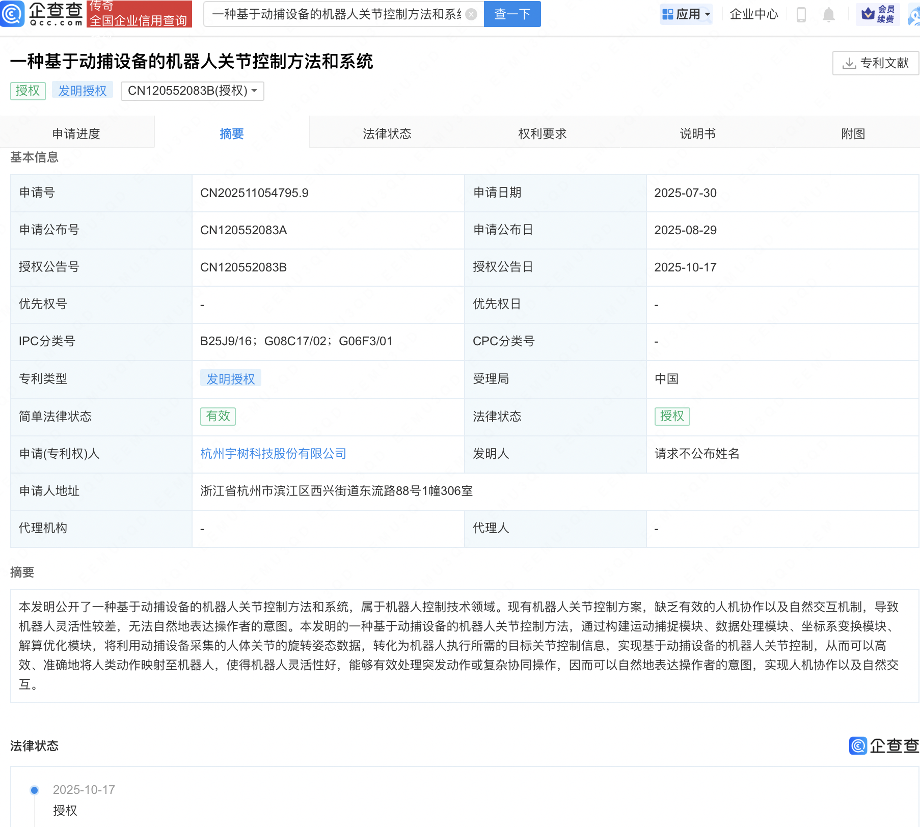 近日,杭州宇树科技股份有限公司“一种基于动捕设备的机器人关节控制方法和系统”专利获授权。企查查专利摘要显示,本发明属于机器人控制技术领域,现有机器人关节控制方案,缺乏有效的人机协作以及自然交互机制,导致机器人灵活性较差,无法自然地表达操作者的意图。本发明通过构建运动捕捉模块、数据处理模块、坐标系变换模块、解算优化模块,将利用动捕设备采集的人体关节的旋转姿态数据,转化为机器人执行所需的目标关节控制信息,实现基于动捕设备的机器人关节控制,从而可以高效、准确地将人类动作映射至机器人,使得机器人灵活性好安全配资炒股门户,能够有效处理突发动作或复杂协同操作,因而可以自然地表达操作者的意图,实现人机协作以及自然交互。