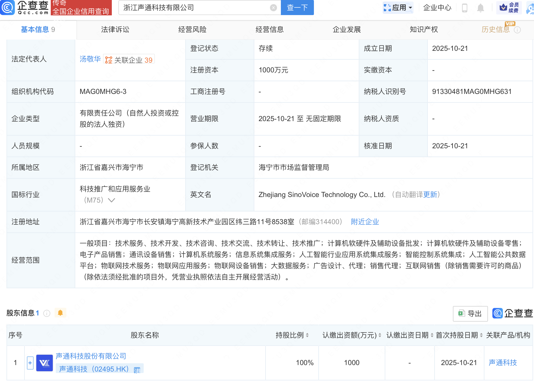 近日股票怎样配资,浙江声通科技有限公司成立,注册资本1000万元,经营范围包含:人工智能行业应用系统集成服务;智能控制系统集成;人工智能公共数据平台;物联网技术服务;物联网应用服务等。企查查股权穿透显示,该公司由声通科技(02495.HK)全资持股。